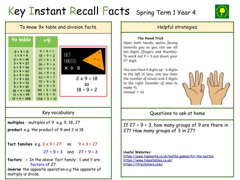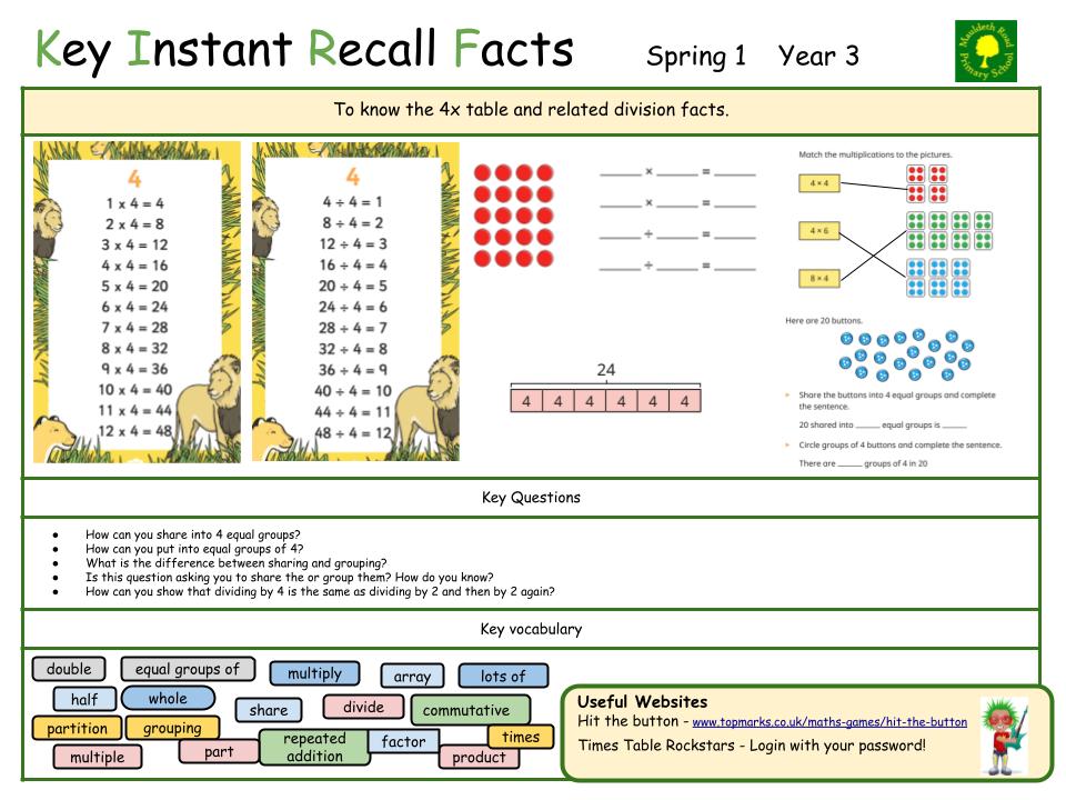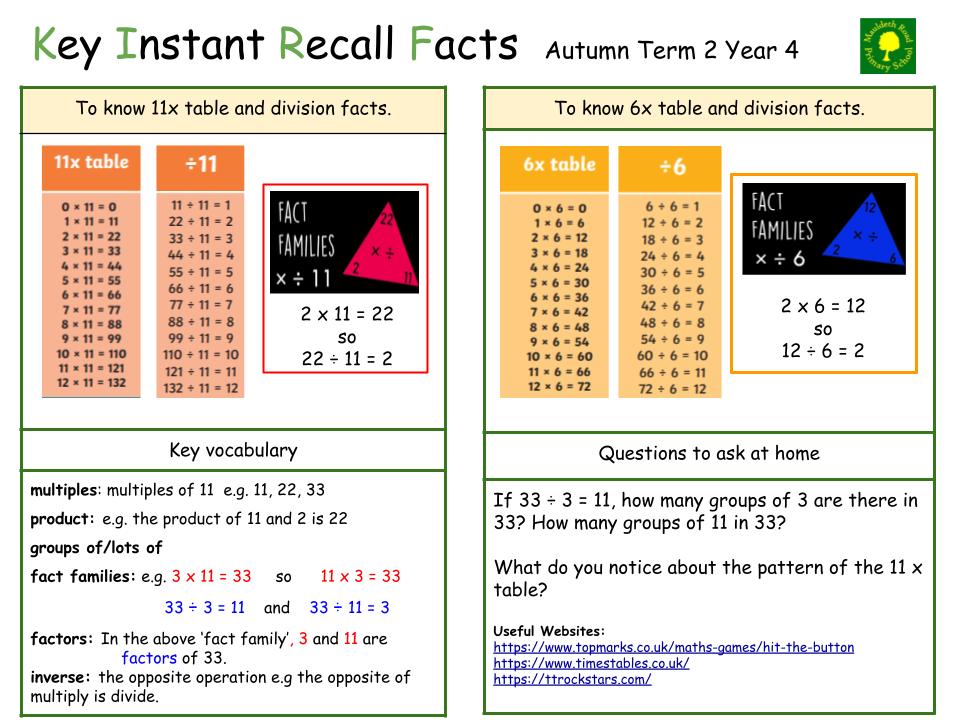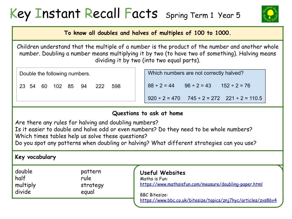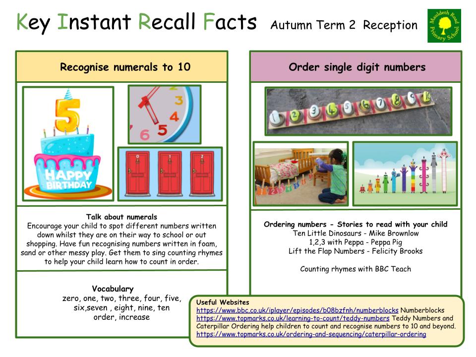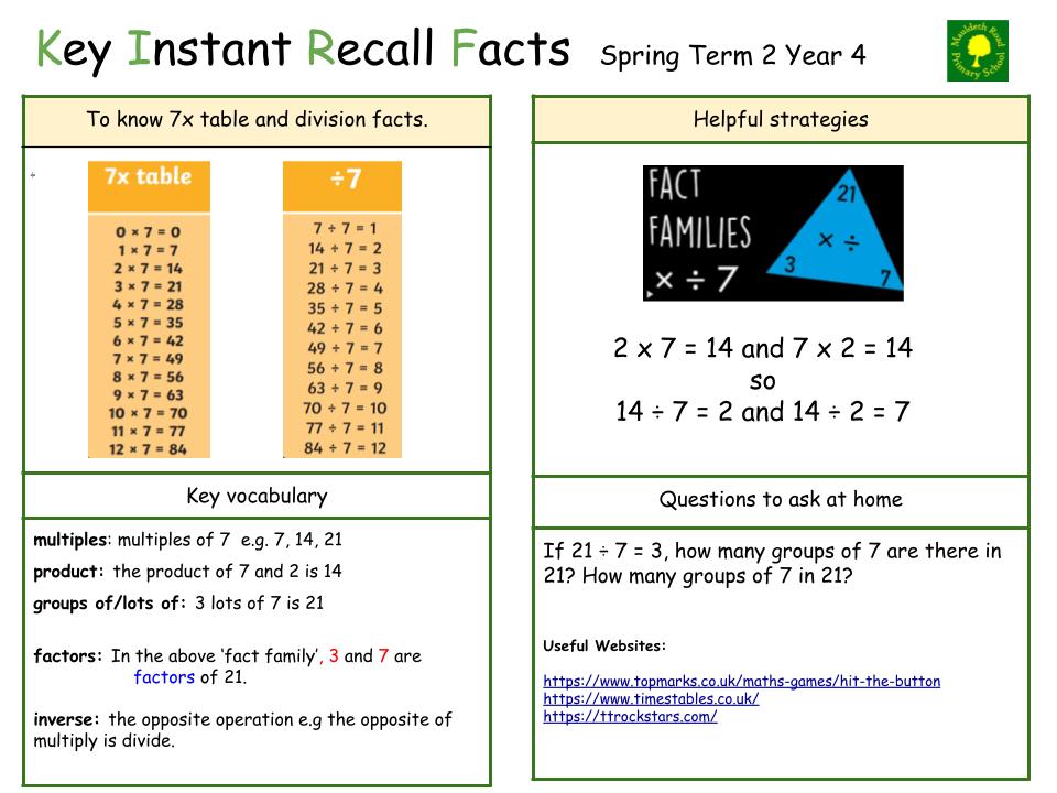 Each half term, children will focus on a Key Instant Recall Fact (KIRF) to practise and learn at home for the half term. They will also be available on our school website under the maths section and each child will receive a copy to keep at home. They are not designed to be a time-consuming task and can be practised anywhere – in the car, walking to school, etc. Regular practice - little and often – helps children to retain these facts and keep their skills sharp. Throughout the half term, the KIRFs will also be practised in school and your child’s teacher will assess whether they have been retained.