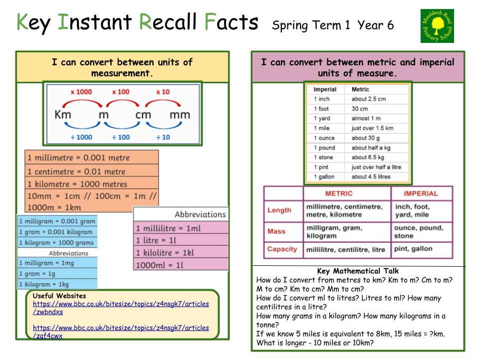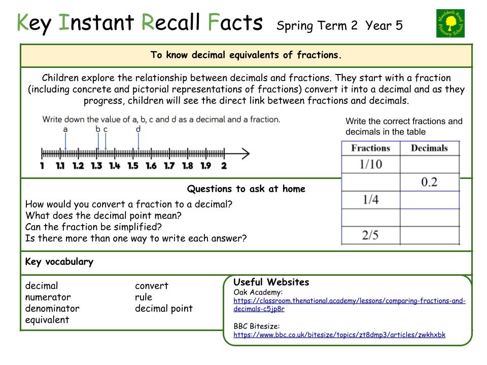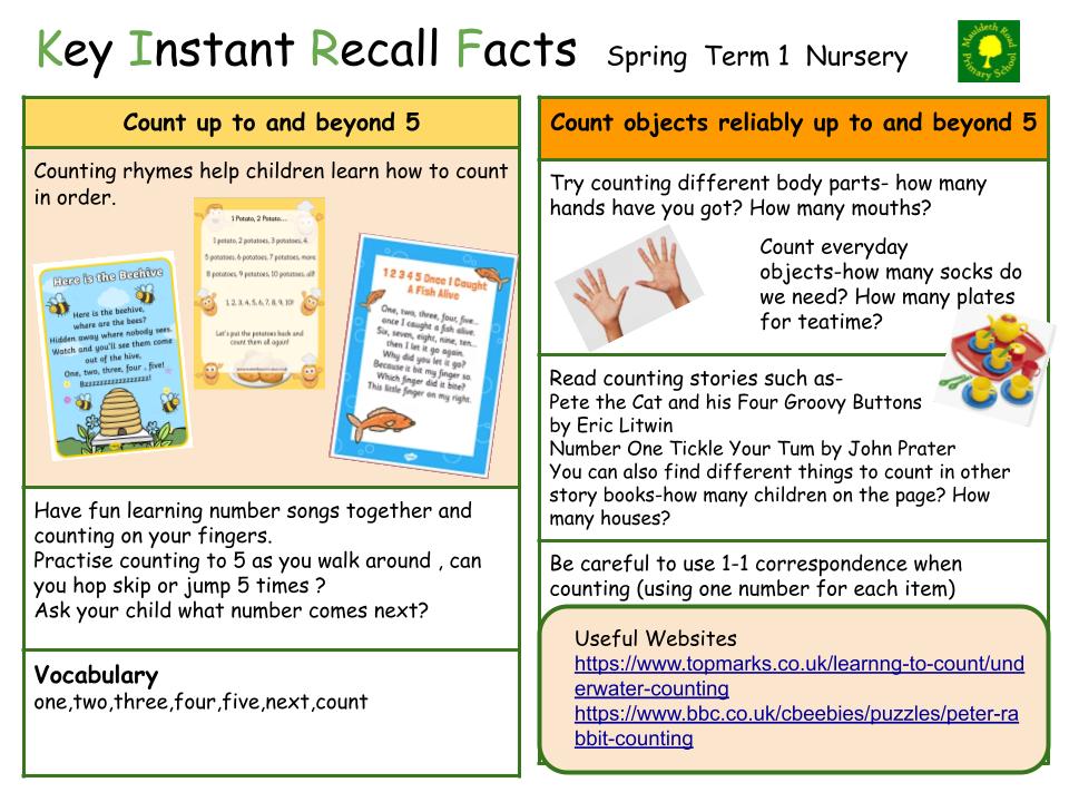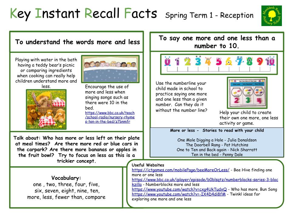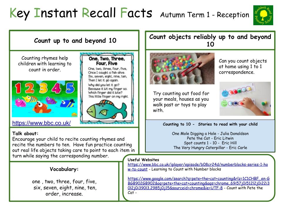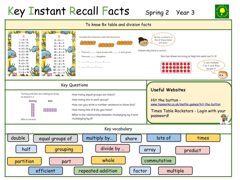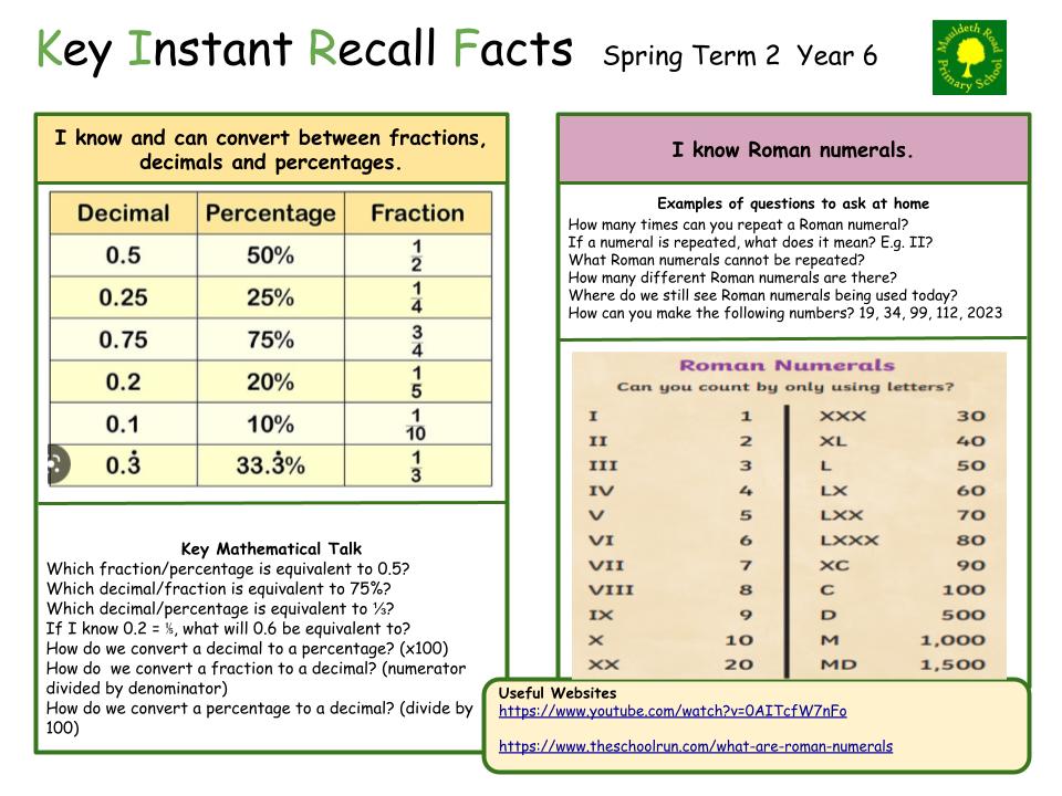 Each half term, children will focus on a Key Instant Recall Fact (KIRF) to practise and learn at home for the half term. They will also be available on our school website under the maths section and each child will receive a copy to keep at home. They are not designed to be a time-consuming task and can be practised anywhere – in the car, walking to school, etc. Regular practice - little and often – helps children to retain these facts and keep their skills sharp. Throughout the half term, the KIRFs will also be practised in school and your child’s teacher will assess whether they have been retained.