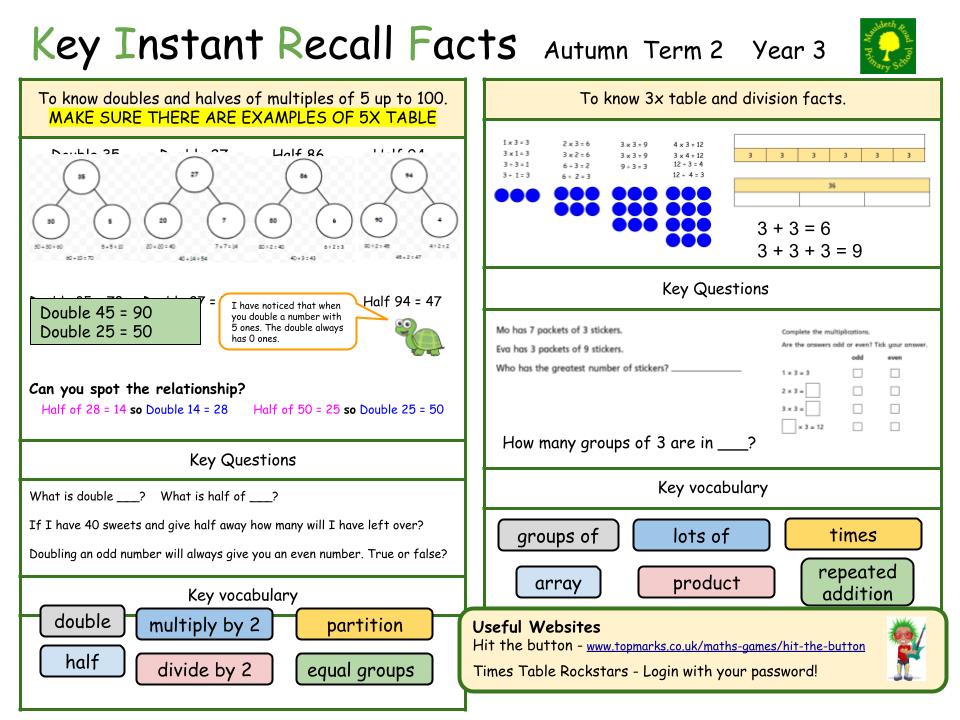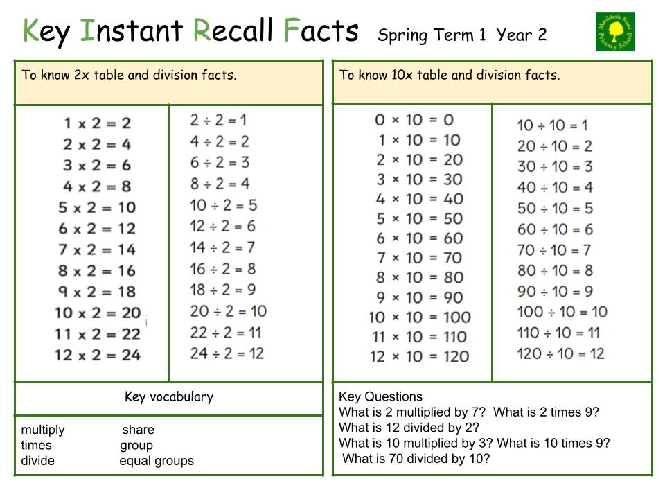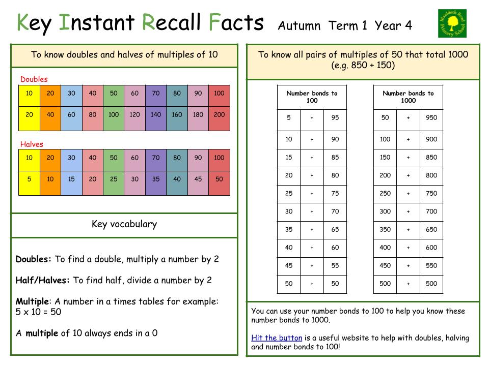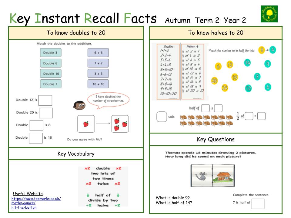 Instant recall of facts helps enormously with mental agility in maths lessons. When children move onto written calculations, knowing these key facts is very helpful. For your child to become more efficient in recalling them easily, they need to be practised frequently and for short periods of time.